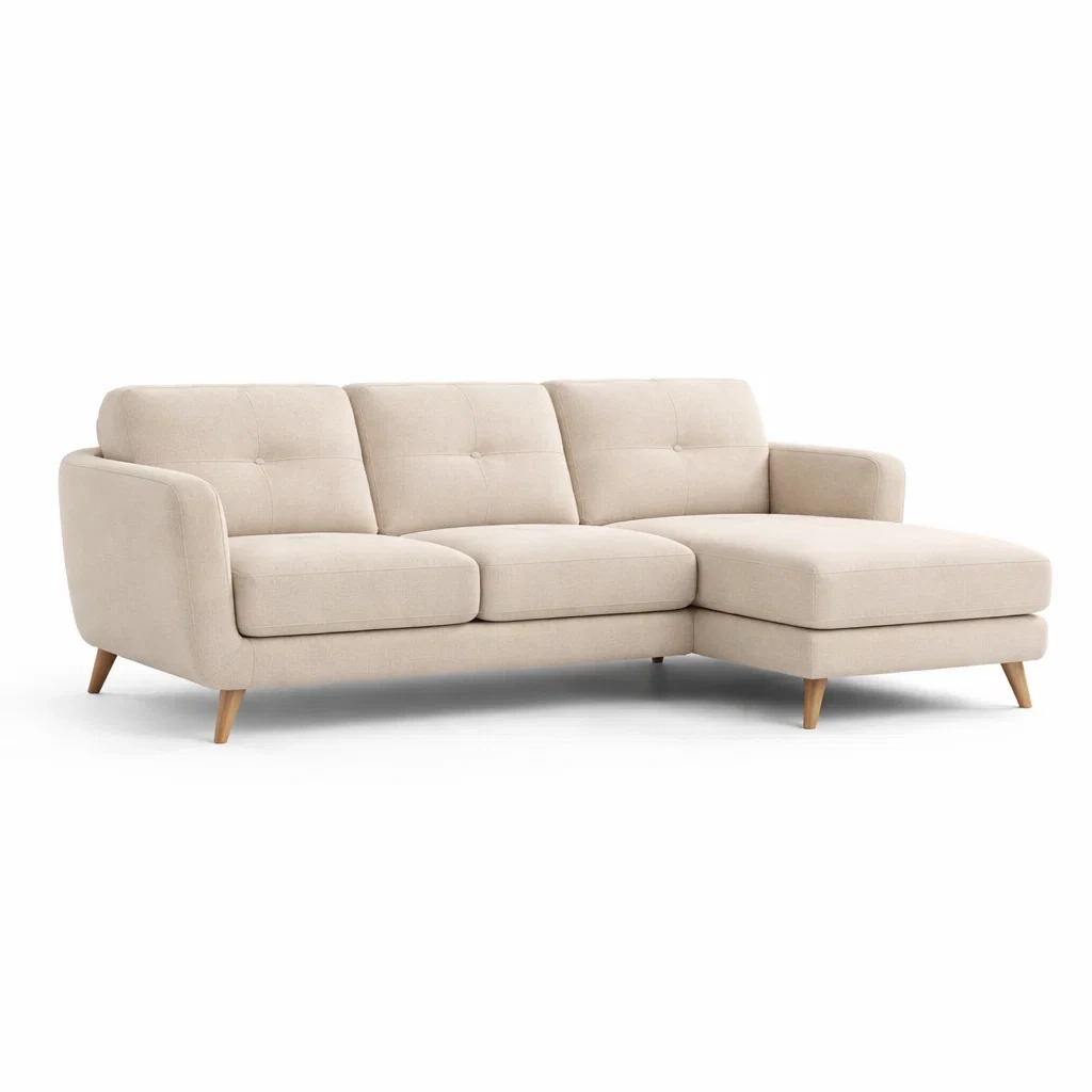 Questo divano ad angolo è realizzato in poliestere con un telaio in legno di faggio. Ha una lunghezza di 240 cm, una larghezza di 160 cm e un'altezza totale di 85 cm. L'altezza del sedile è di 45 cm e offre spazio per tre persone. Le gambe sono in legno. I cuscini del sedile sono removibili per facilitare la pulizia. Non è presente alcuna funzione di regolazione.