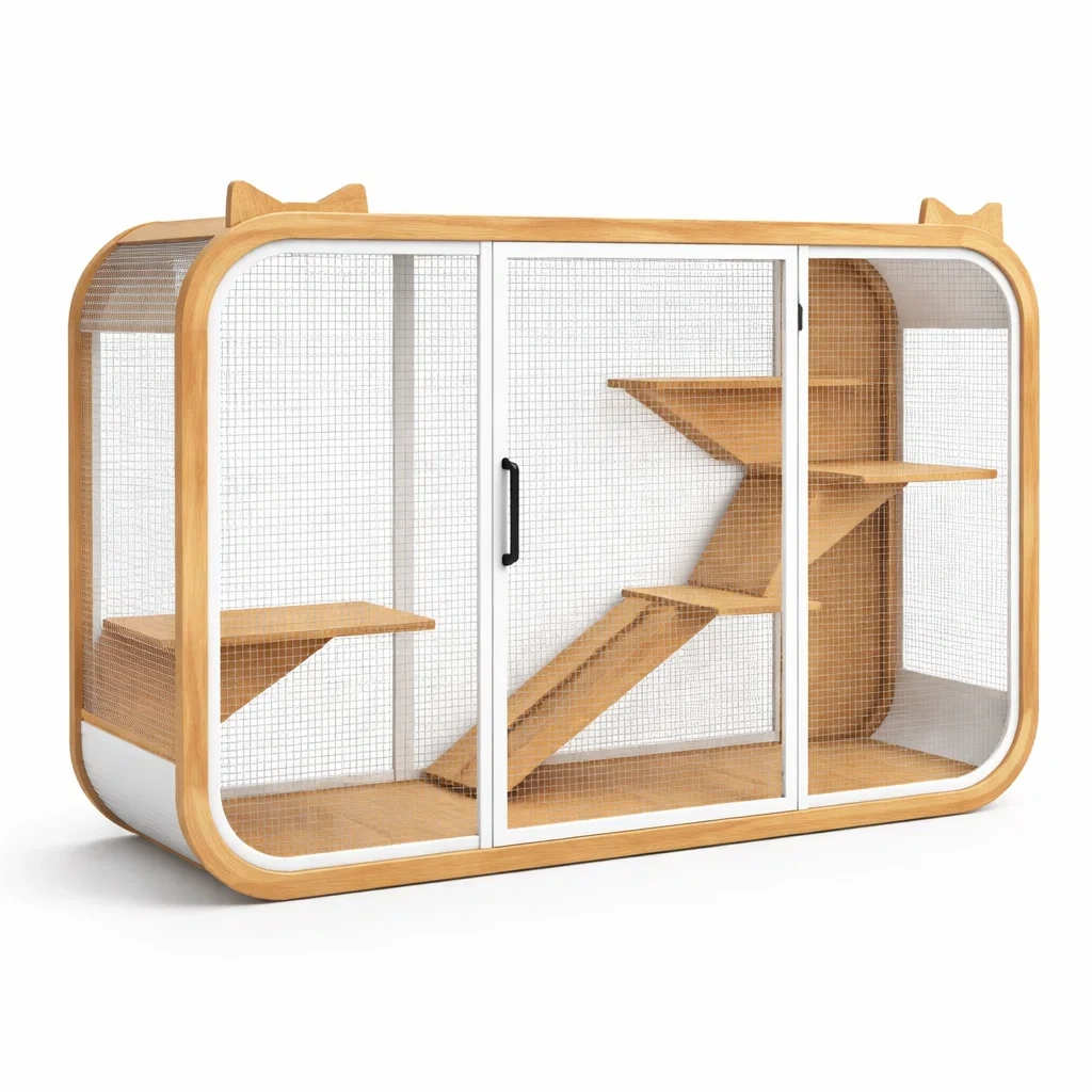 Gabbia per gatti in legno e metallo con mensole